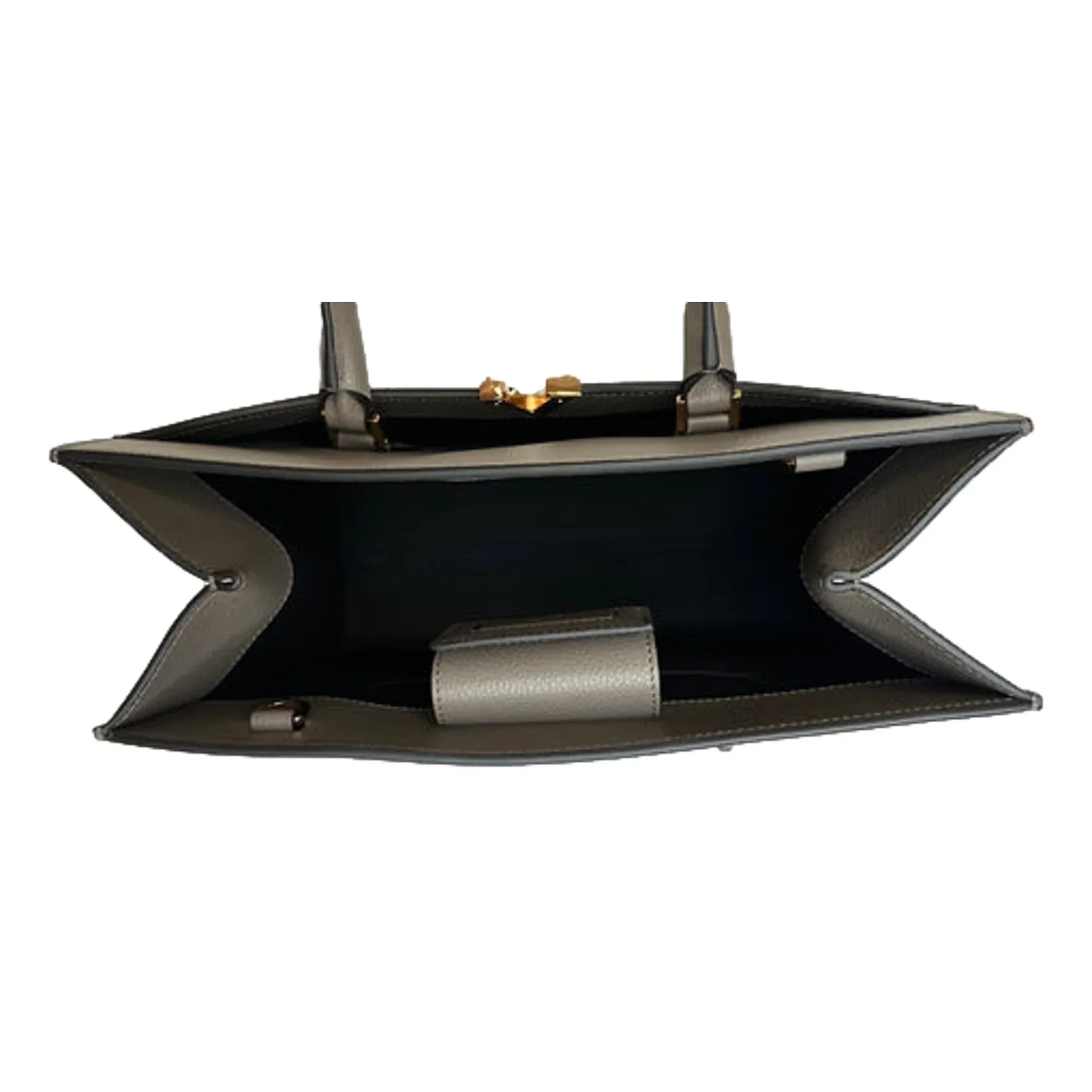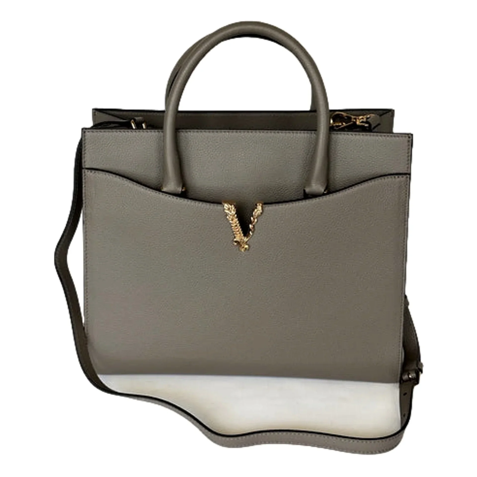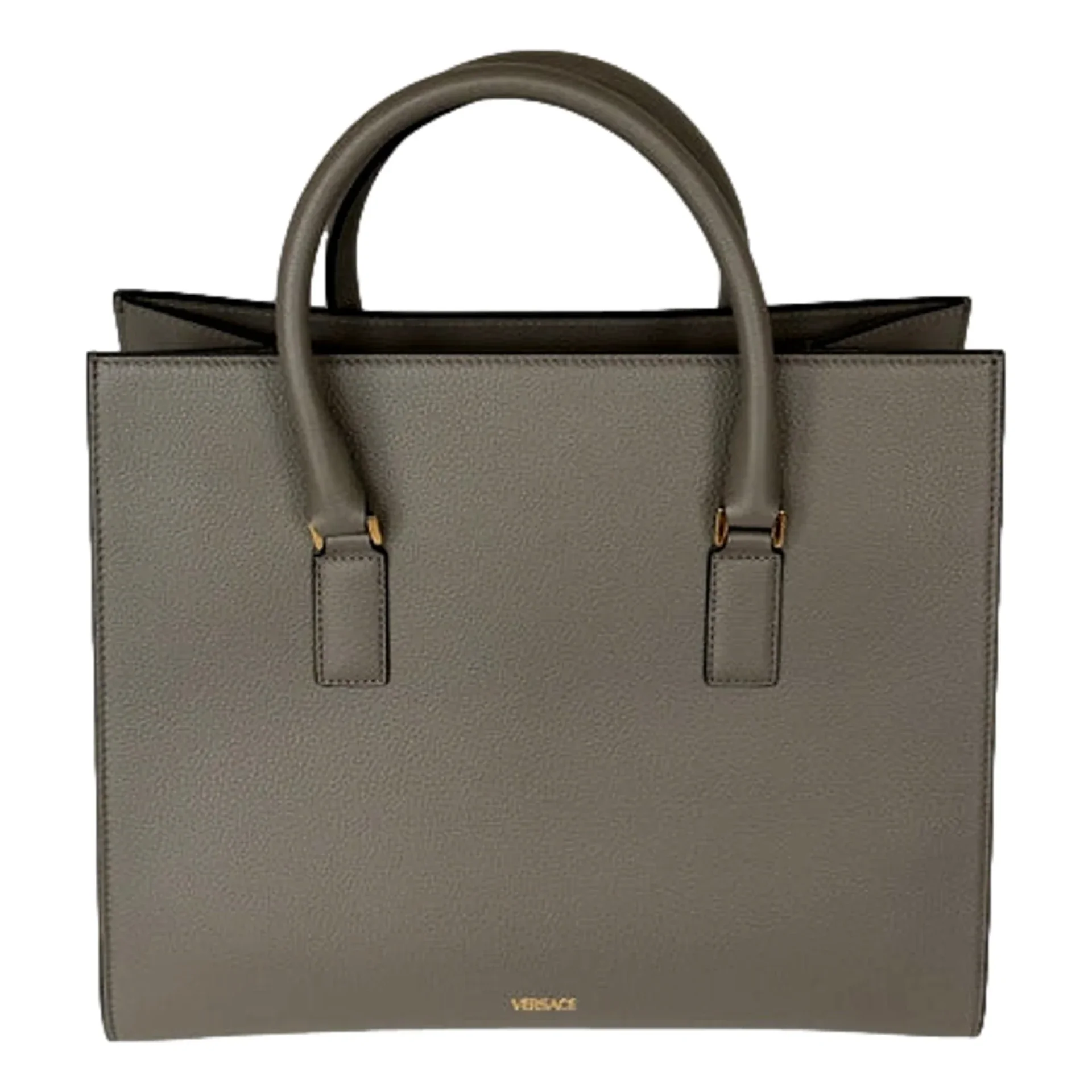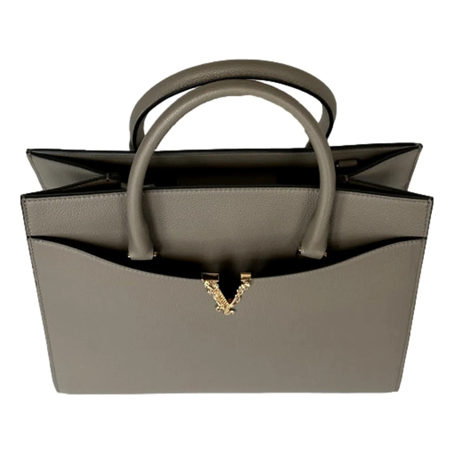 Versace Virtus Calfskin Leather Medium Top Handle Tote Taupe Grey