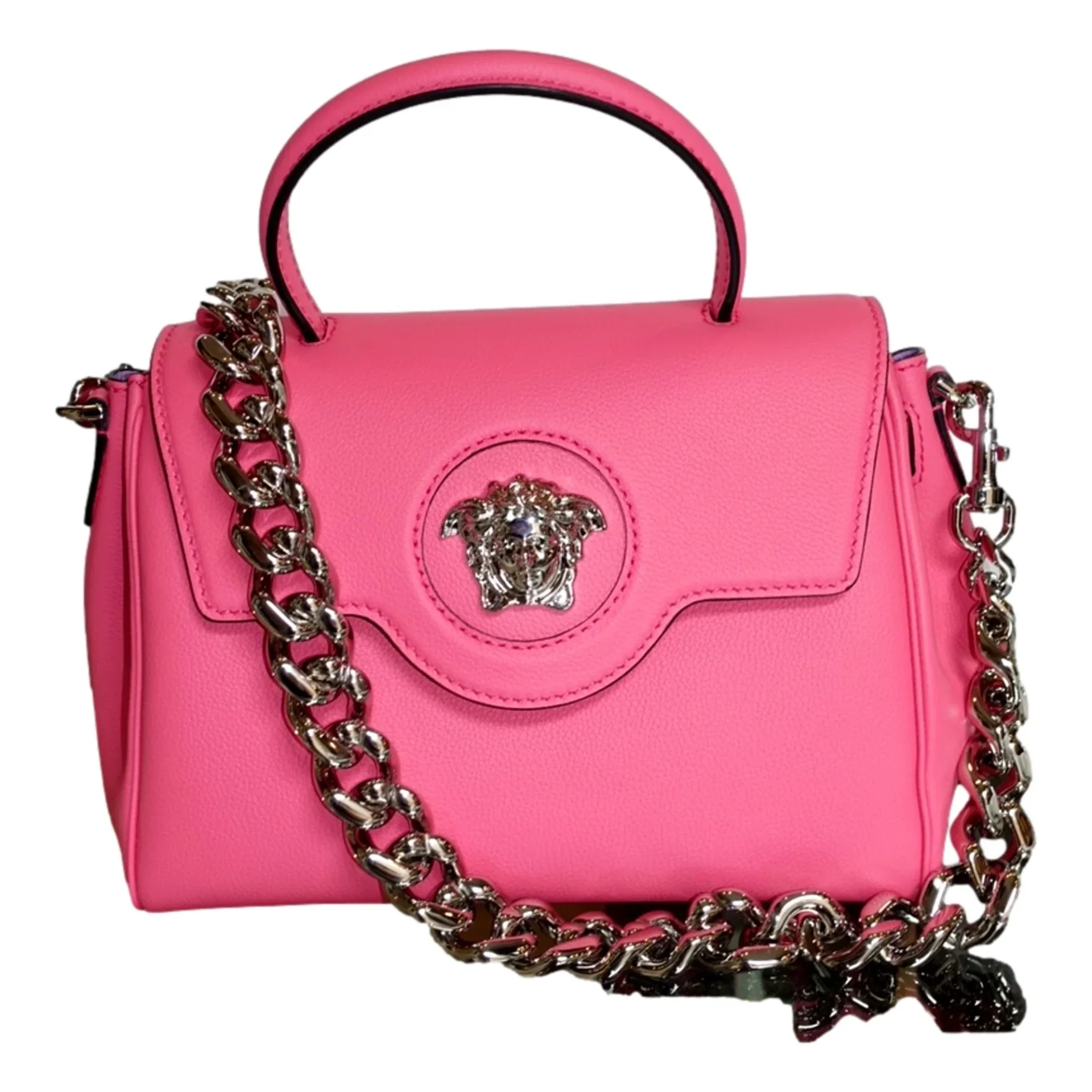 Versace Top Handle Flamingo Pink Vitello Leather Handbag